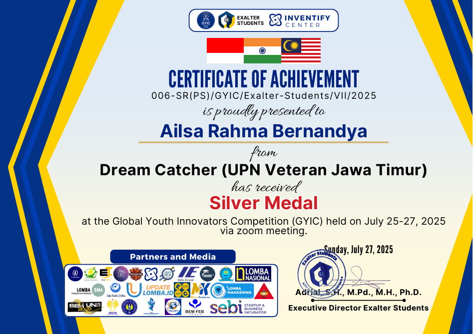 Tidak hanya berjaya dalam kategori tim, prestasi individu yang membanggakan juga dipersembahkan oleh Ailsa Rahma Bernandya. Mahasiswi Prodi Manajemen ini berhasil meraih “Medali Perak” (Silver Medal) dalam salah satu kategori kompetisi individu. Pencapaian ini membuktikan kompetensi dan daya saing Ailsa yang luar biasa di hadapan para kompetitor global.
